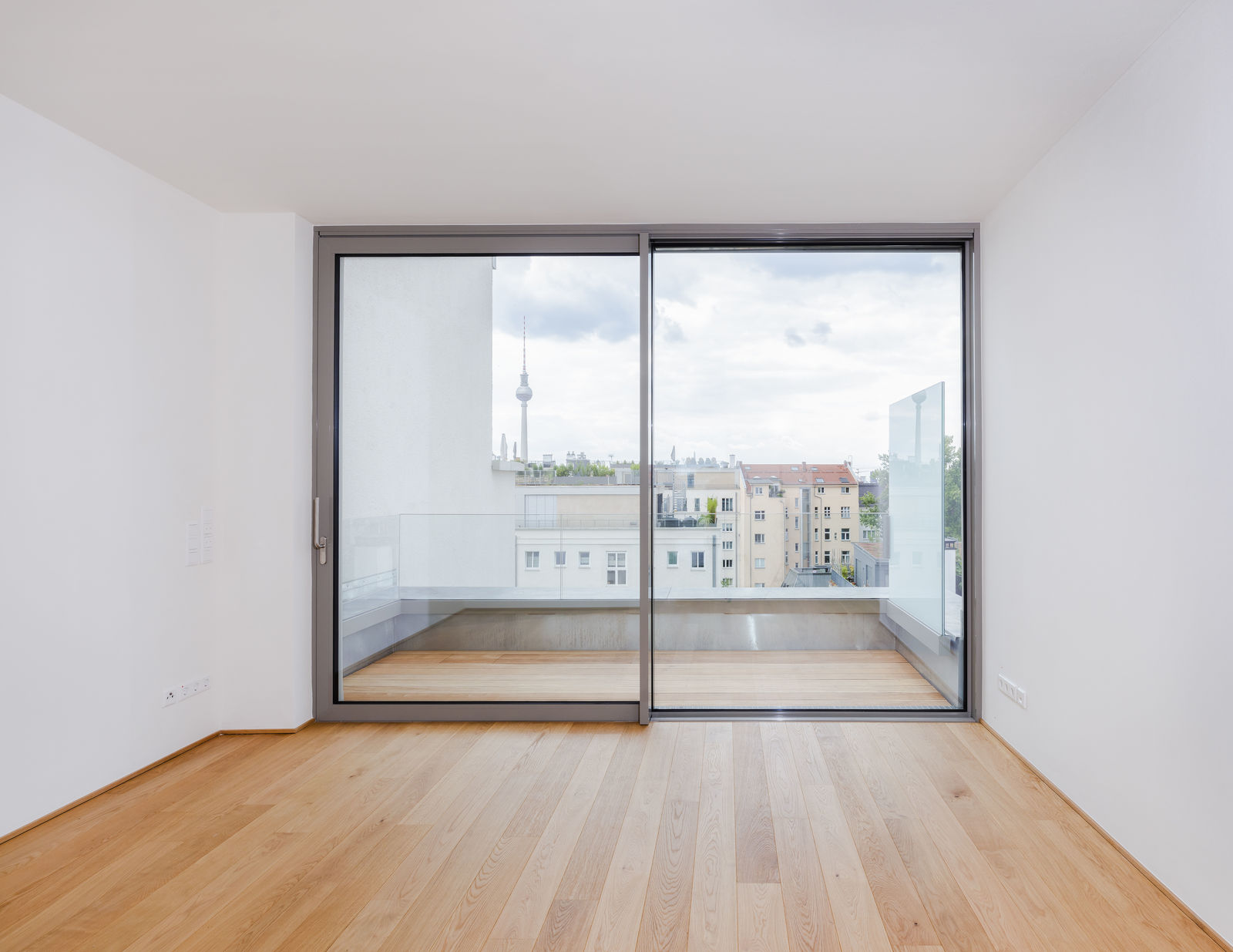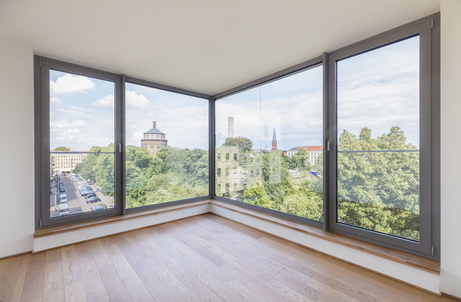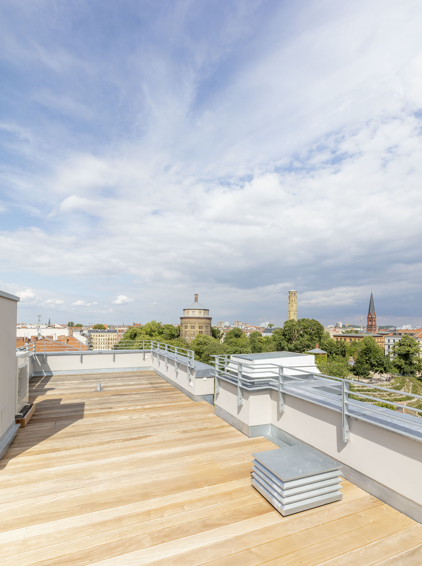 For the vacant site, the total available construction space totaled in a width of 4,8 and depth of 17 meters. Despite the challenge, it was possible to develop a ground plan with apartments which radiate a feeling of generosity. All apartments and the commercial unit on the ground floor have one thing in common: while the corner windows on the northside offer a view on the lively Wasserturmplatz, the wide balcony and terrace windows on the southside capture the calming atmosphere of the grand courtyard garden. All this is complemented by a breathtaking panoramic view of Berlin from the roof terrace.