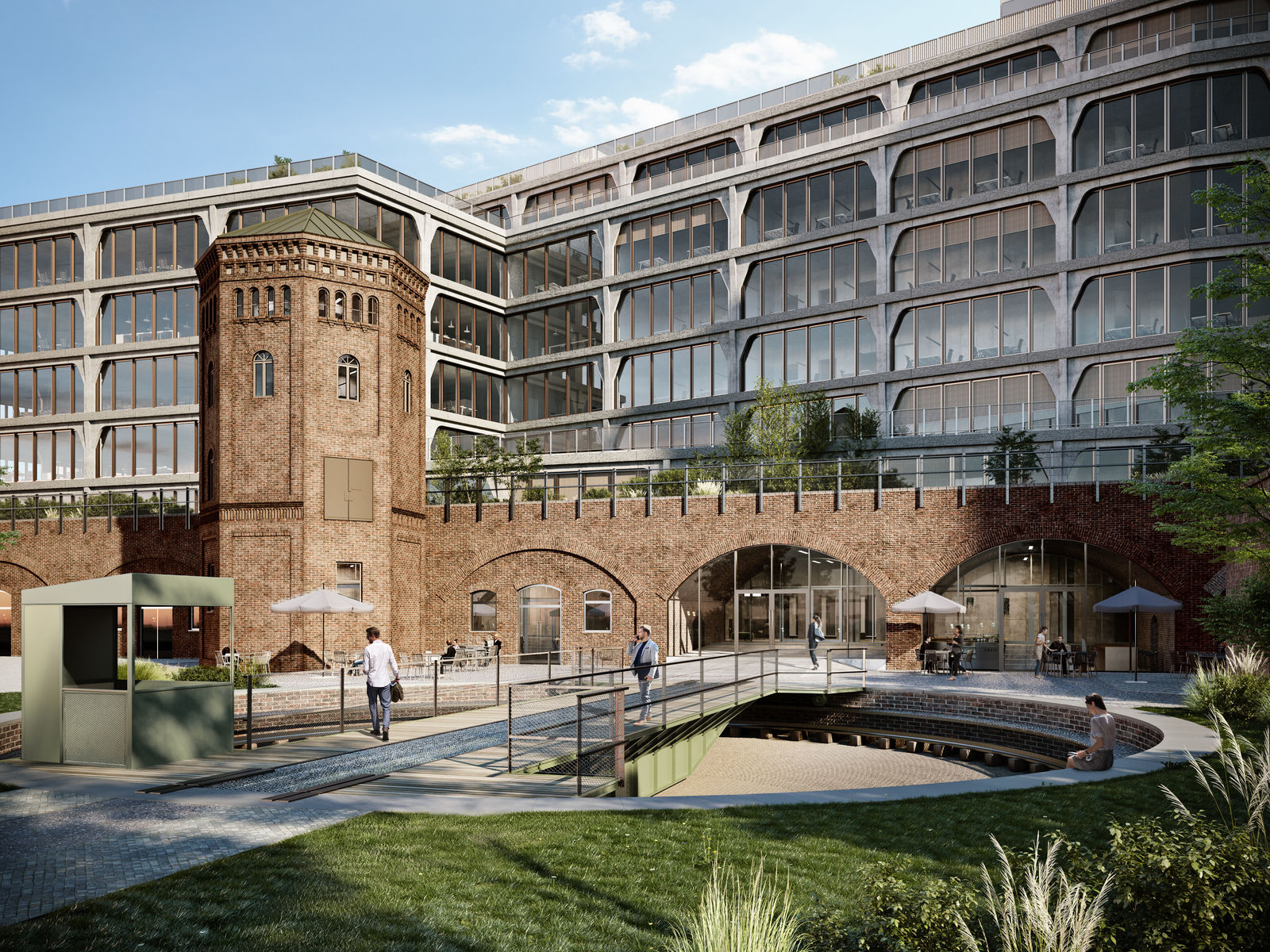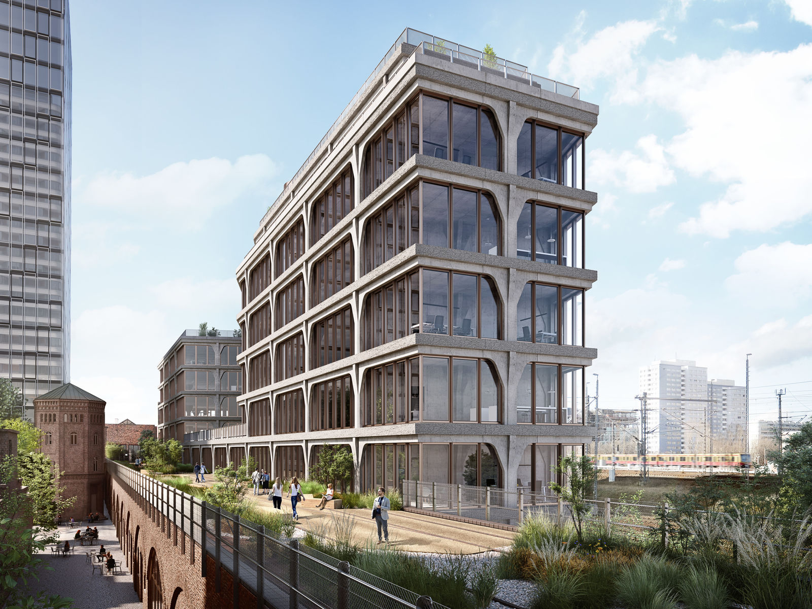 The design of the new building incorporates the structual and visual elements of the adjecent historical Postbahnhof building and interprets them in a unique way. The new building is meant to be a complementing addition to the historical building, integrating the preexisting viaduct and watertower. The main objective of the design is to create a close relation with the historical landmark through materials and composition, to create a significant contrast with the adjecent modern buildings.